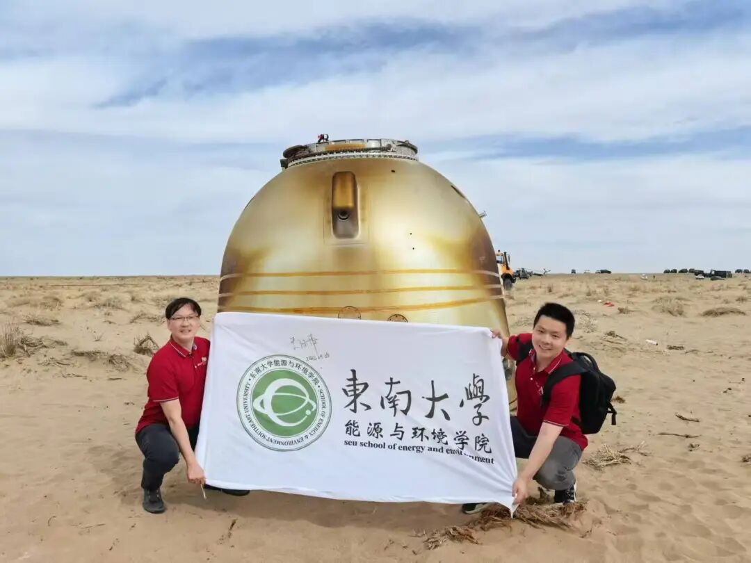 在着陆场附近的观测区,我院青年教师许波、巩峰手持院旗,近距离感受这激动人心的时刻,见证东南大学2012届校友王浩泽,完成中国航天史上首位女性航天飞行工程师的太空“差旅”。