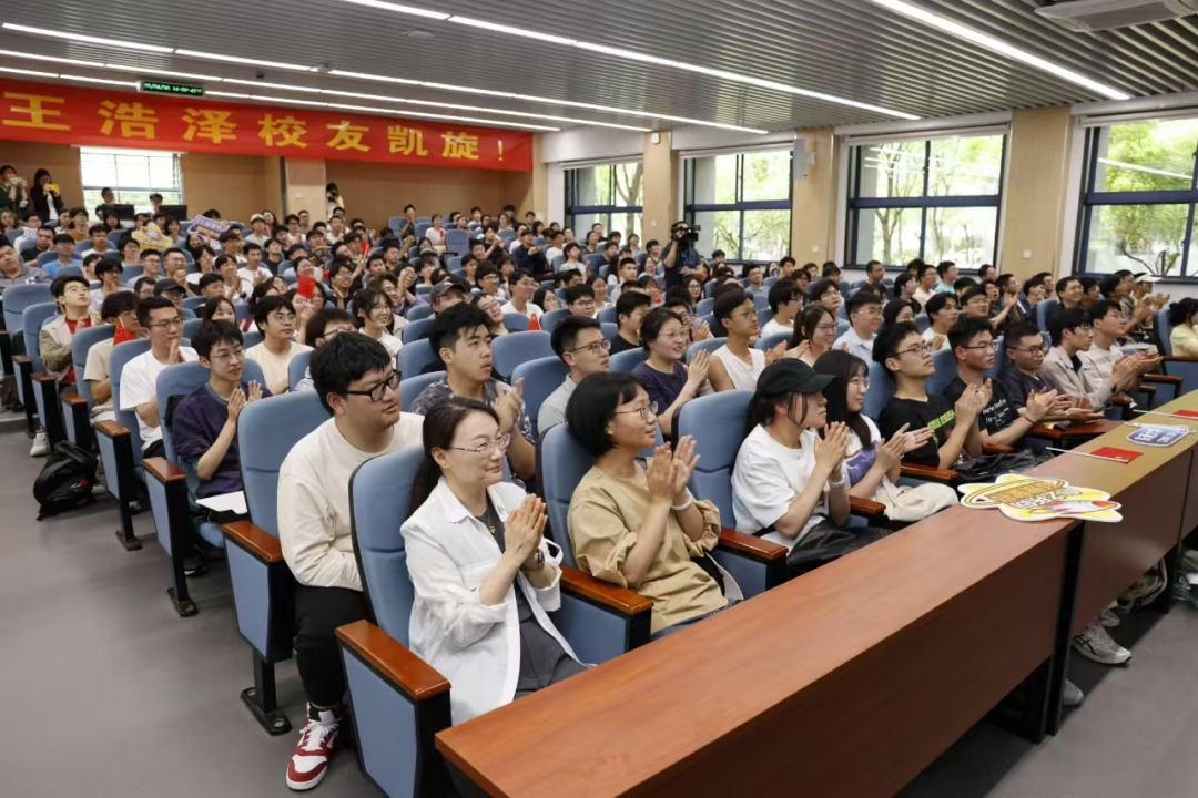 “成功着陆啦!”“宇宙学姐回来啦!”“学弟学妹欢迎师姐回家!”“我们也想上天”一瞬间,现场欢呼声与掌声响彻校园。