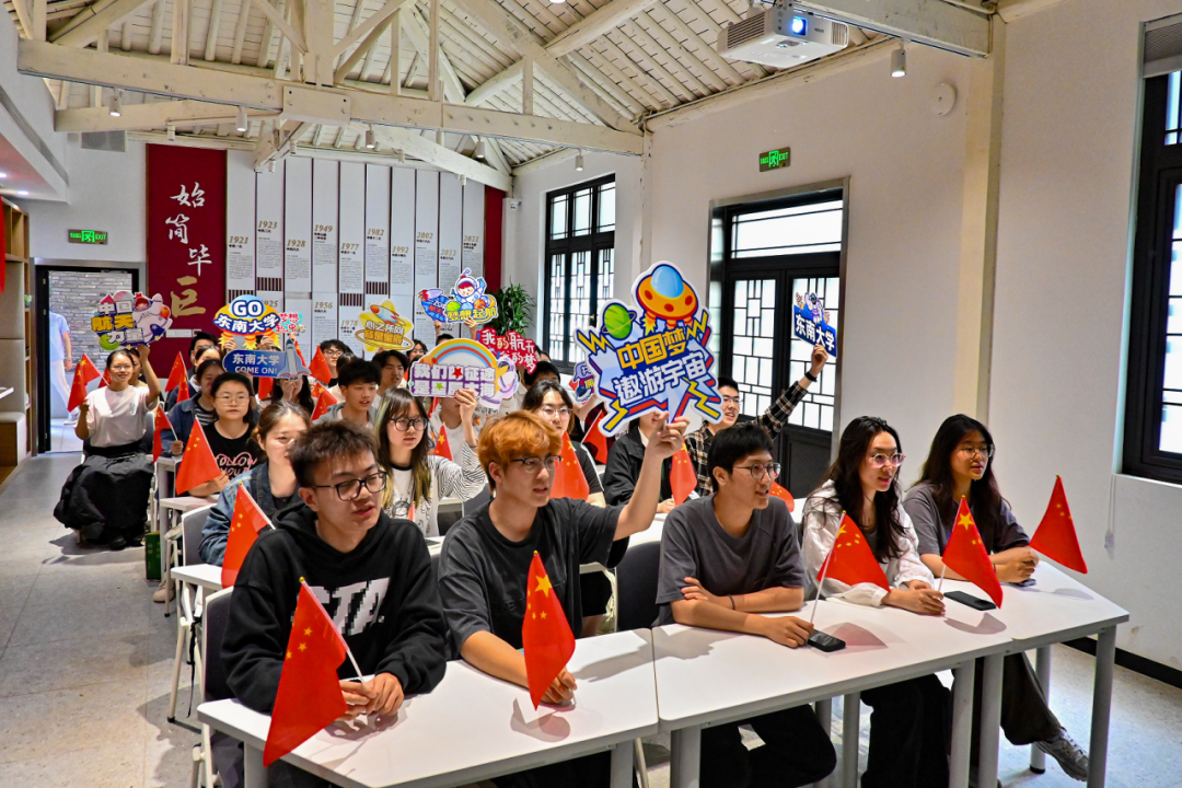 4月30日下午,东南大学阶梯教室内,三百余名师生屏息凝望直播屏幕,期待神舟十九号载人飞船成功返回:当返回舱拖着橙红色尾焰刺破云层,在东风着陆场成功着陆,舱门打开,航天员蔡旭哲、宋令东、王浩泽一一安全出舱,他们透过屏幕向大家挥手示意。